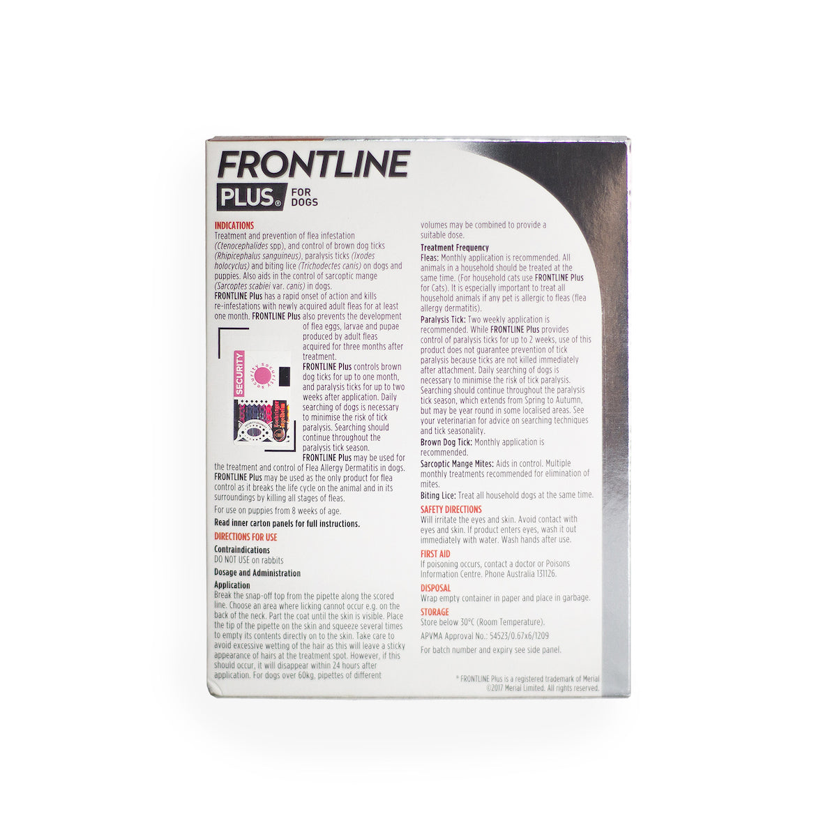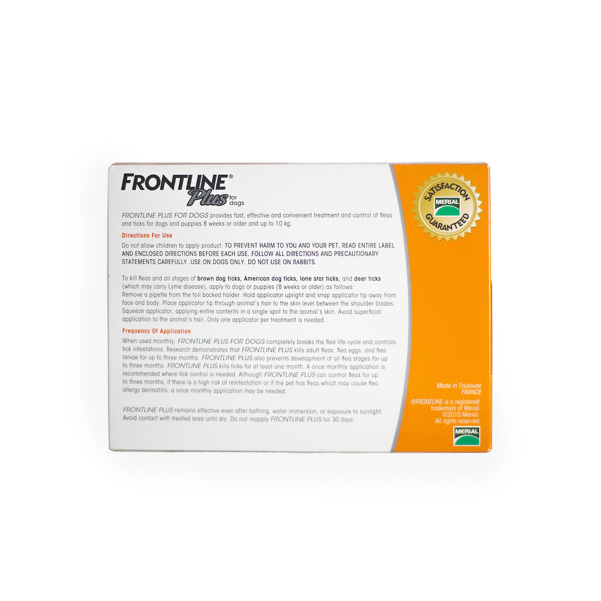 What it is FRONTLINE Plus provides fast-acting and long-lasting control of fleas, ticks and chewing lice. The Active Ingredients break the flea life cycle by killing adult fleas, flea eggs and larvae that potentially carry disease. It’s waterproof, so your dog stays safe through bathtime and fun swims.